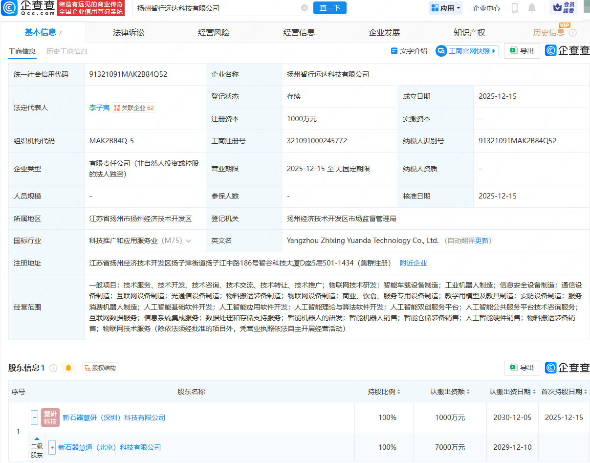 近日,扬州智行远达科技有限公司成立,法定代表人为李子夷,注册资本为1000万元,经营范围包含:物联网技术研发;智能车载设备制造;工业机器人制造;人工智能基础软件开发;人工智能应用软件开发等。企查查股权穿透显示,该公司由新石器慧通(北京)科技有限公司间接全资持股。